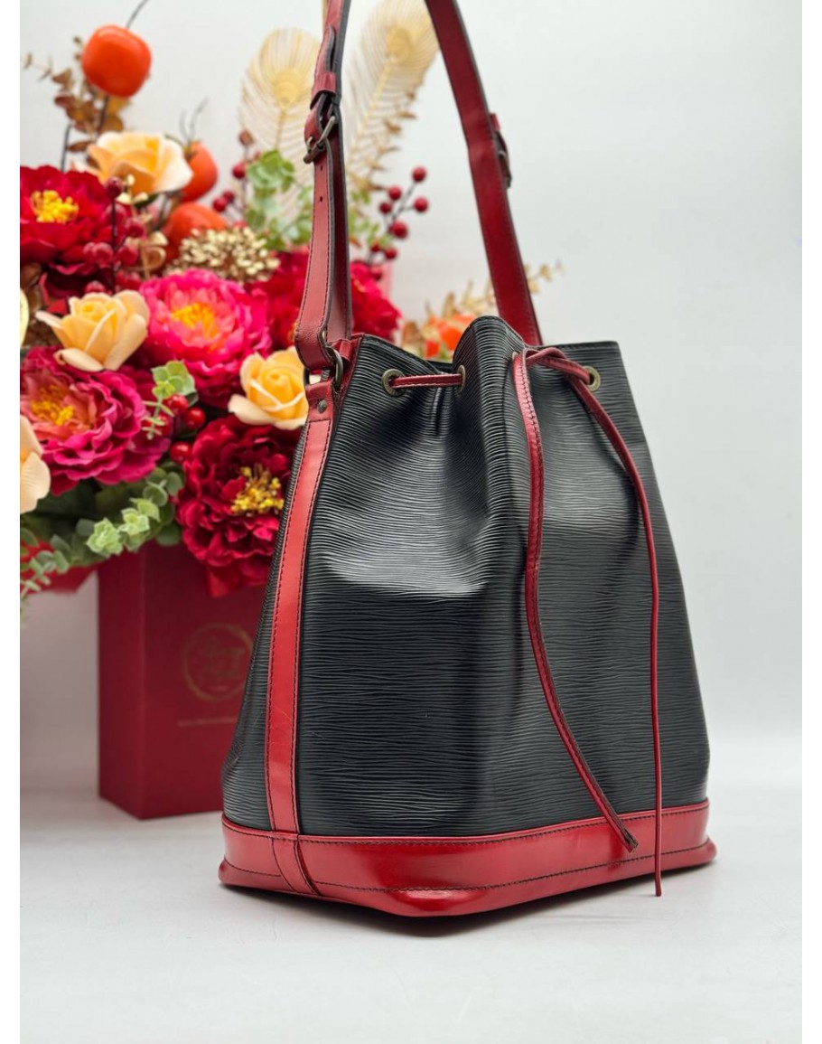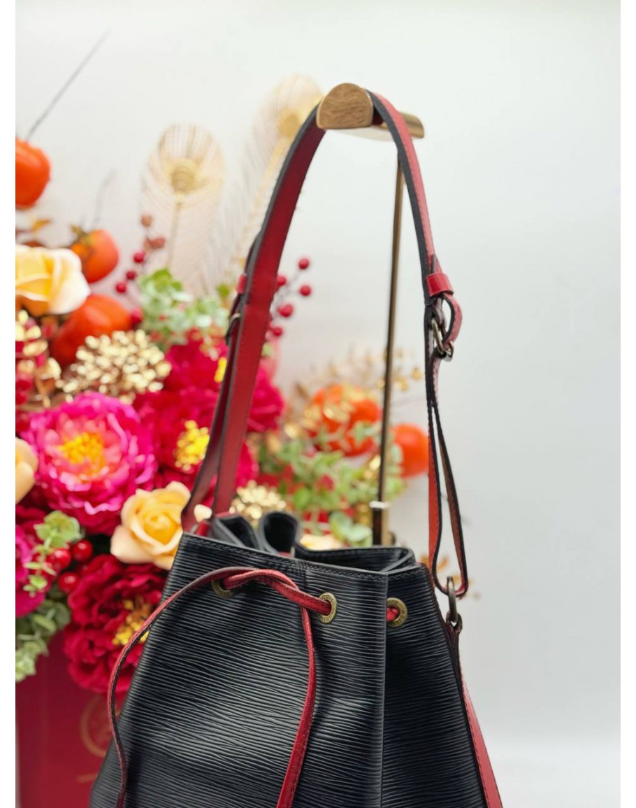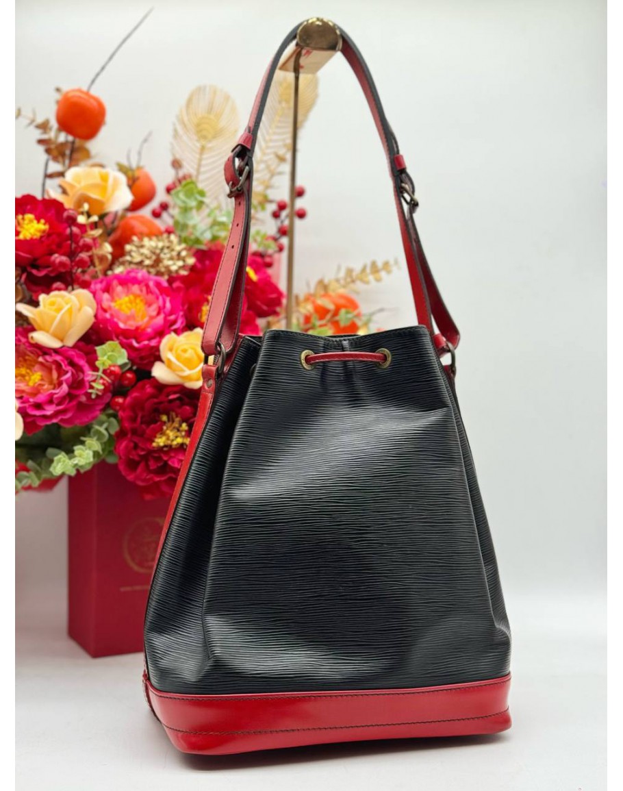 LOUIS VUITTON VINTAGE NOE BUCKET SHOULDER BAG IN BLACK EPI LEATHER & RED CALFSKIN LEATHER