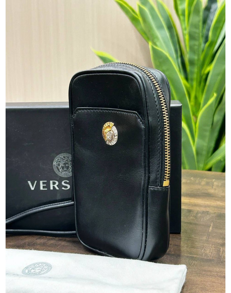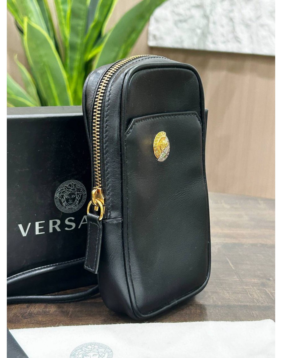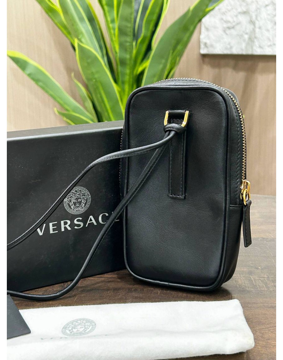 Tags: VERSACE CLASH DEMI MEDUSA GOLD & SILVER SPLIT BLACK LEATHER LANYARD POUCH